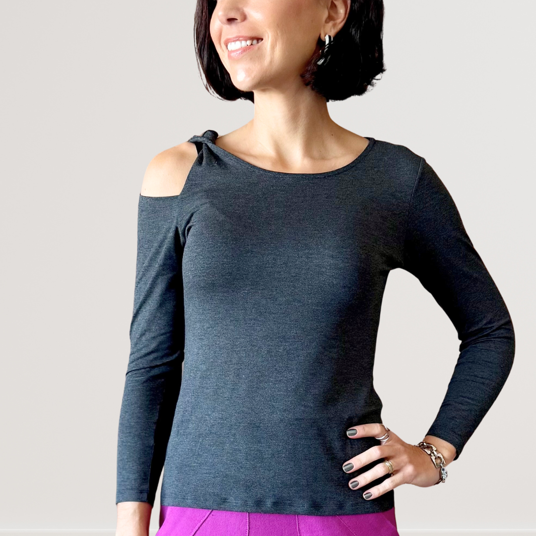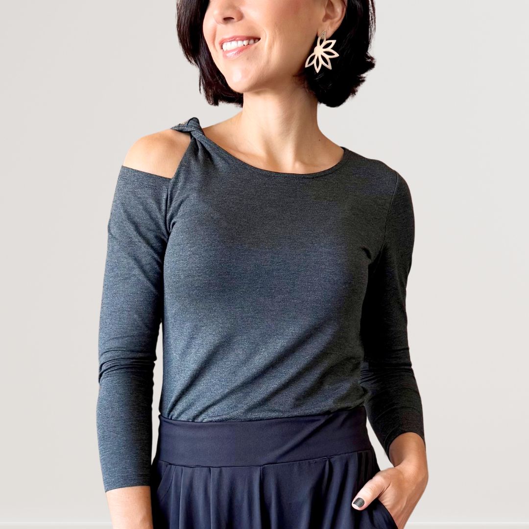 Blusa manga longa com detalhe nó ombro em viscolycra - Grafite