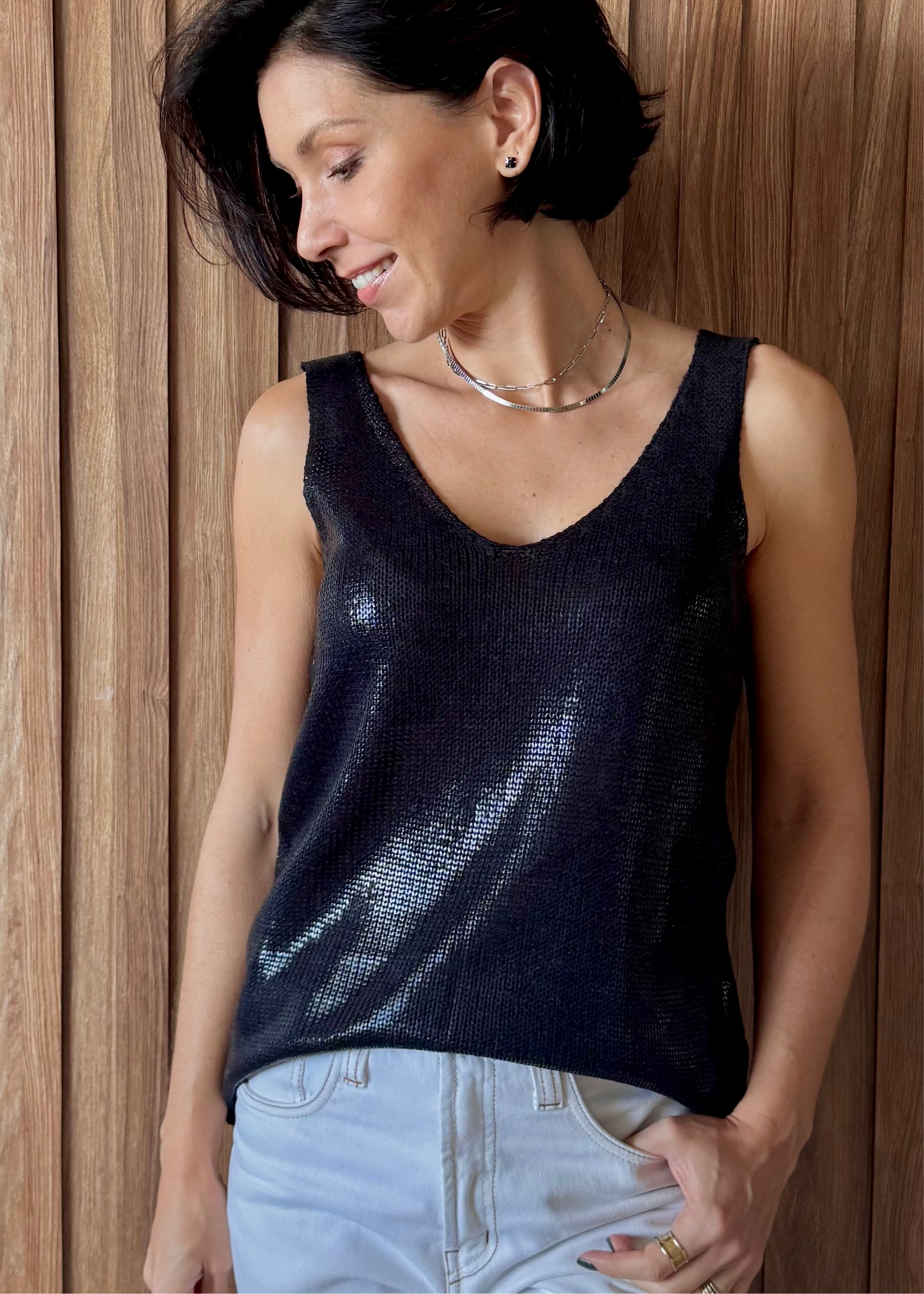Regata em tricô metalizado, puro charme e glamour! Tamanho único, veste até 44. Ouse em looks de dia ou de noite! Permita-se brilhar :)