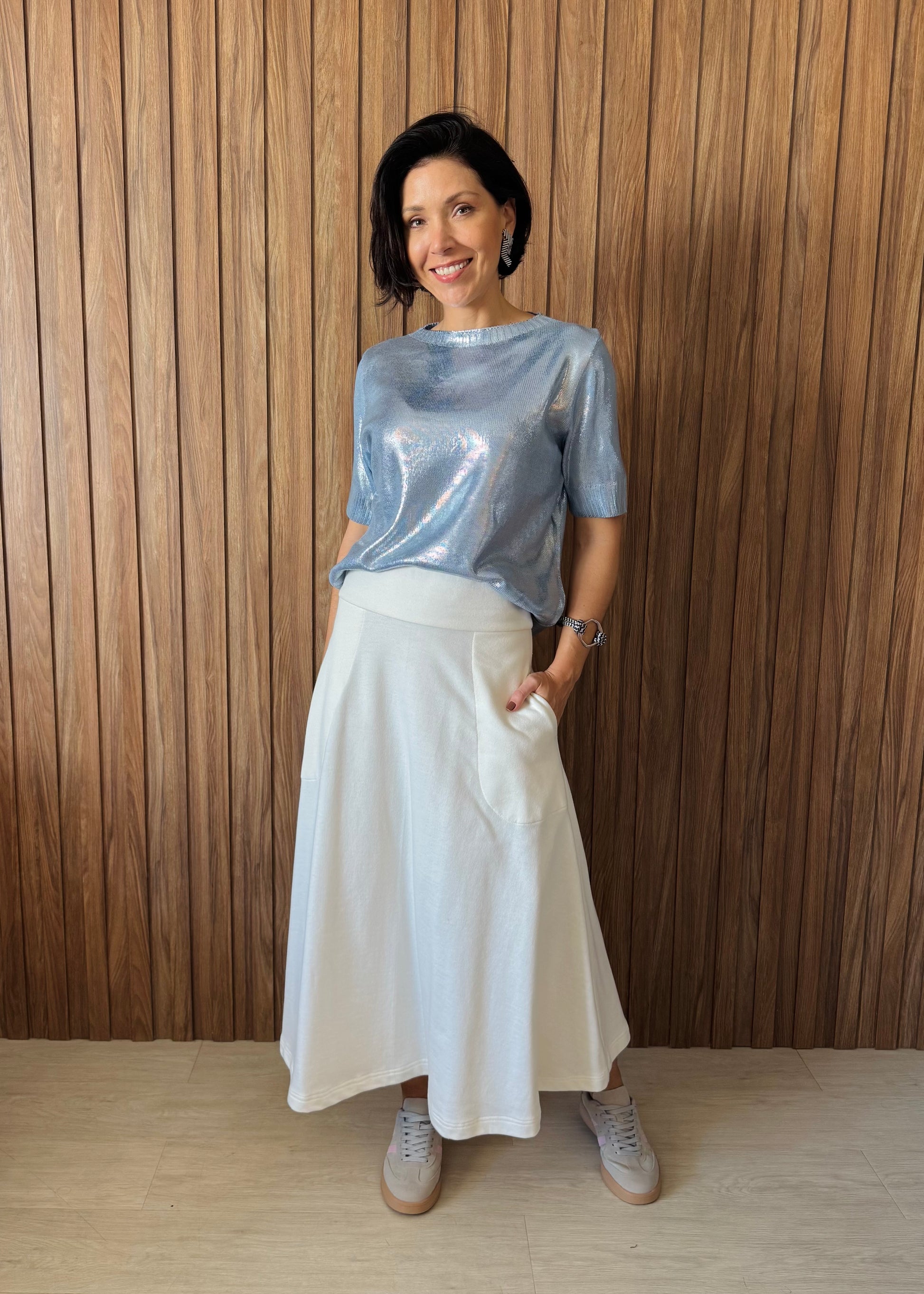 Essa blusa em tricô metalizado é daquelas peças que levantam o look sem esforço.