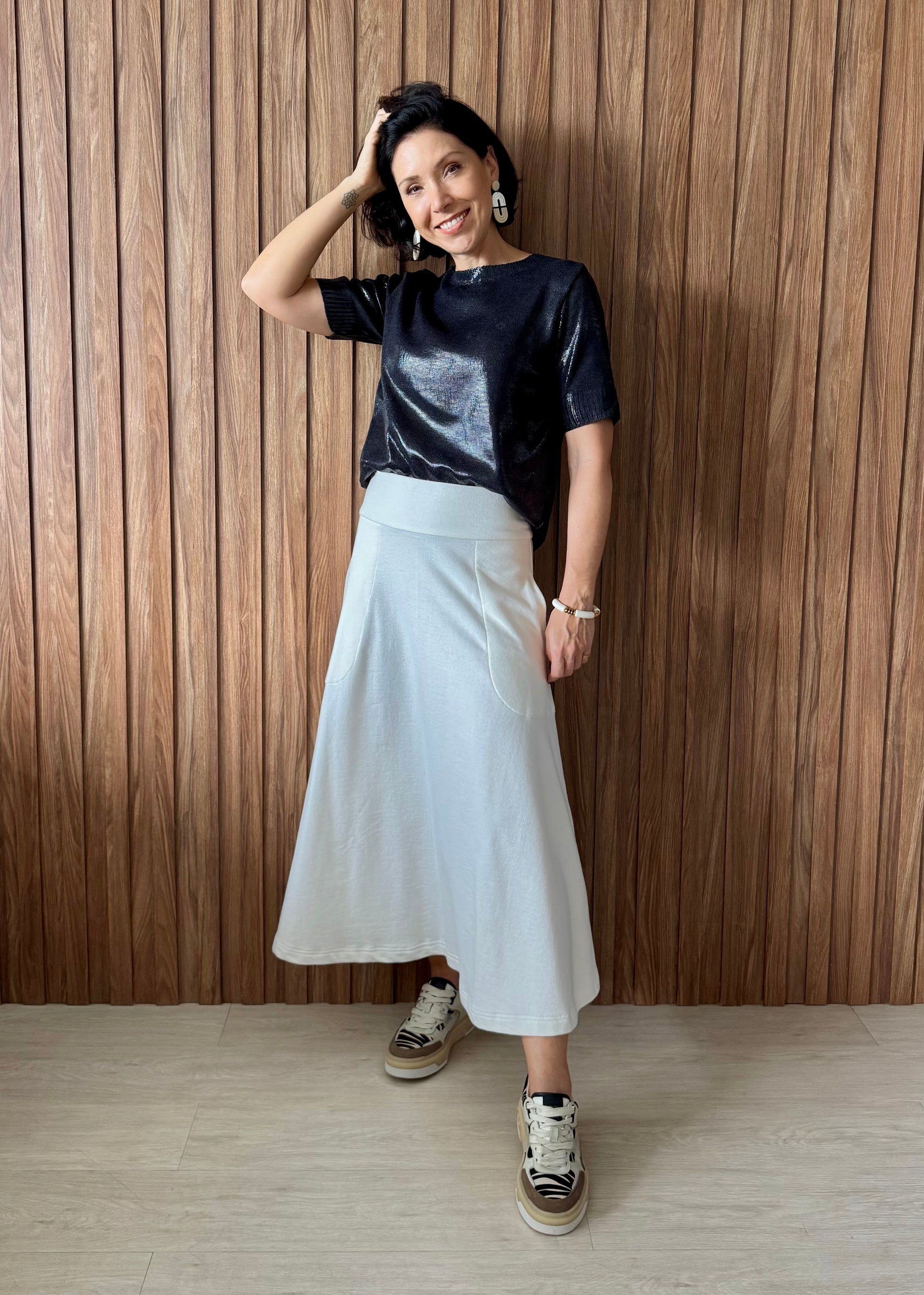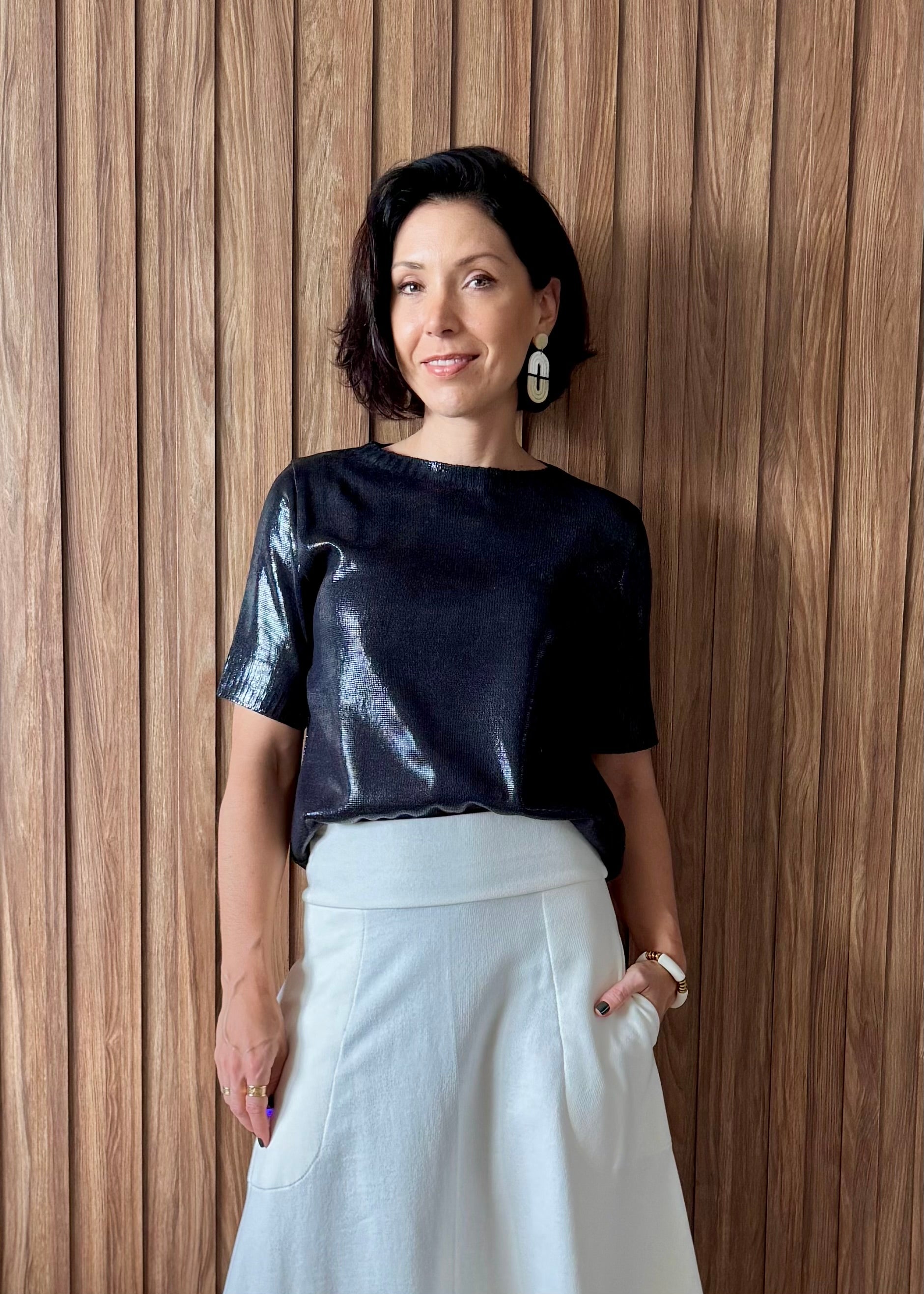 Essa blusa em tricô metalizado é daquelas peças que levantam o look sem esforço.