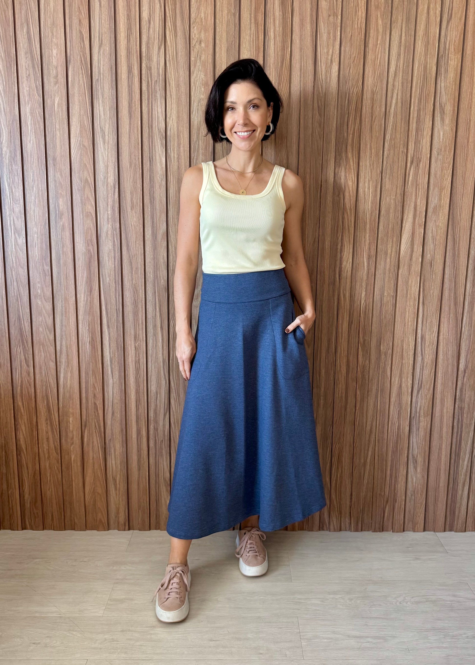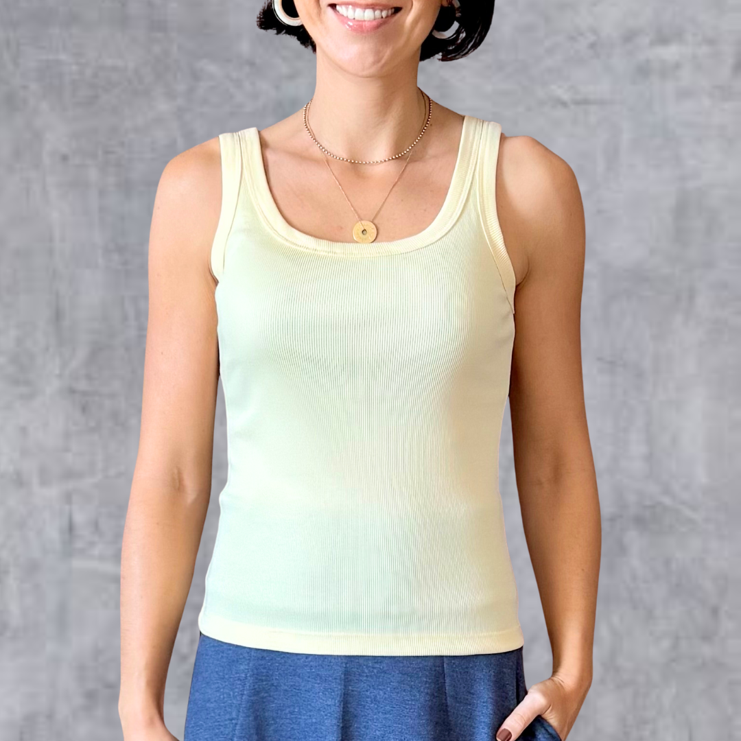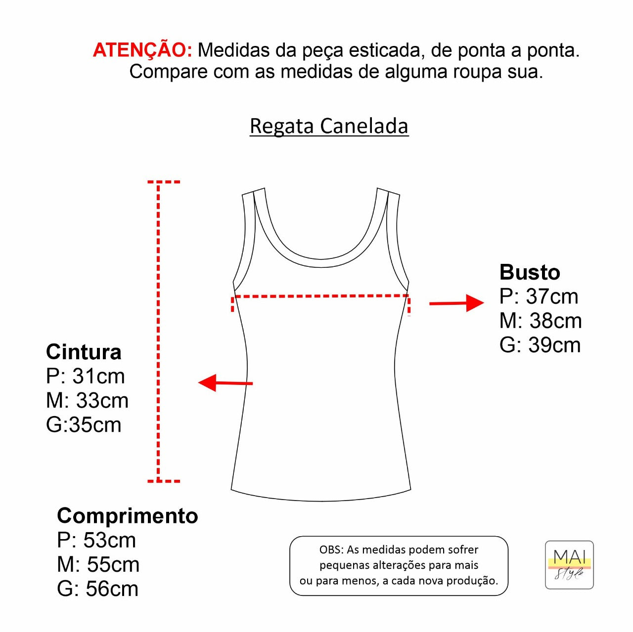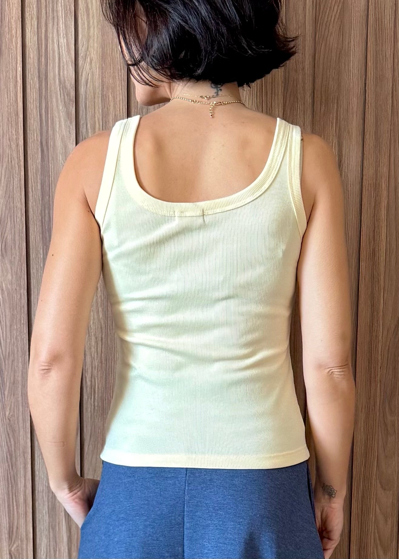 Sabe aquela regata tem-que-ter? É essa. Básica, boa, necessária. Pra usar nos dias de calor sozinha, ou embaixo de uma terceira peça. Esconde a alça do sutiã, fica justinha no corpo, decote em U que valoriza o colo sem mostrar muito, em malha canelada.
